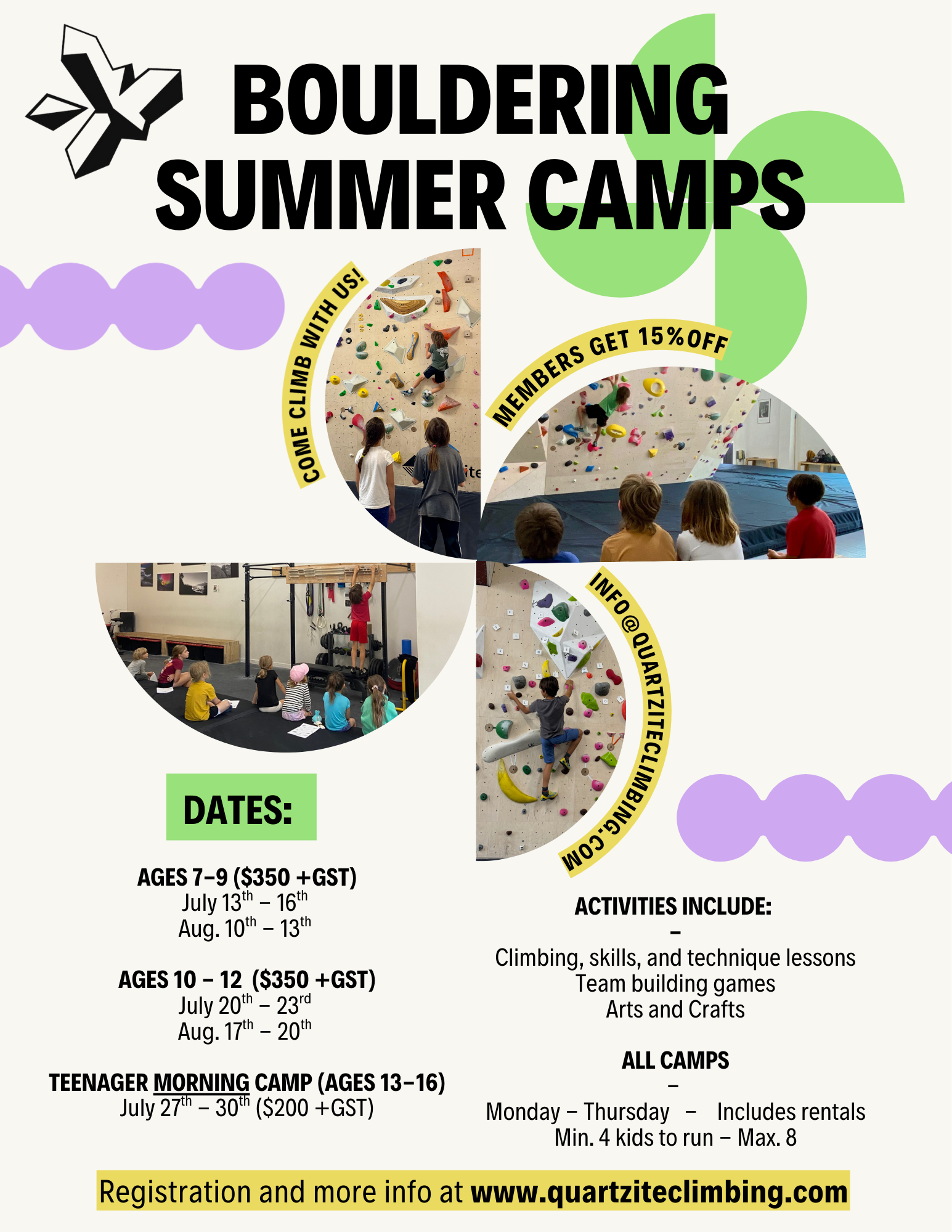 This morning camp (Monday -Thursday) will include, but is not limited to, movement lessons, workout/stretching routines, games, projecting, and learning climbing etiquette. Participants will learn the fundamentals of bouldering techniques and climbing etiquette.